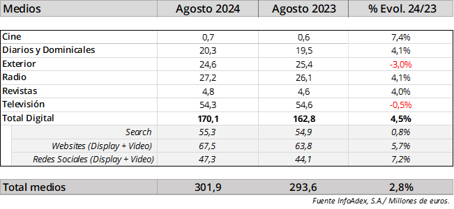 Durante el mes de agosto de 2024, la inversión publicitaria ha alcanzado los 301,9 millones de euros, un 2,8% más que en el periodo equivalente del año anterior cuando el volumen registrado fue de 293,6 millones de euros.