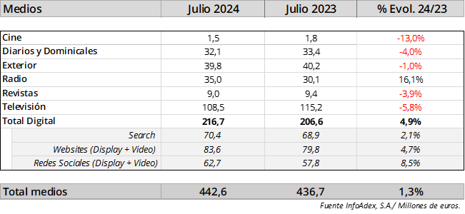Durante el mes de julio de 2024 la inversión publicitaria ha alcanzado los 442,6 millones de euros, aumentando un 1,3% respecto al periodo equivalente del año anterior cuando el volumen registrado fue de 436,7 millones de euros.