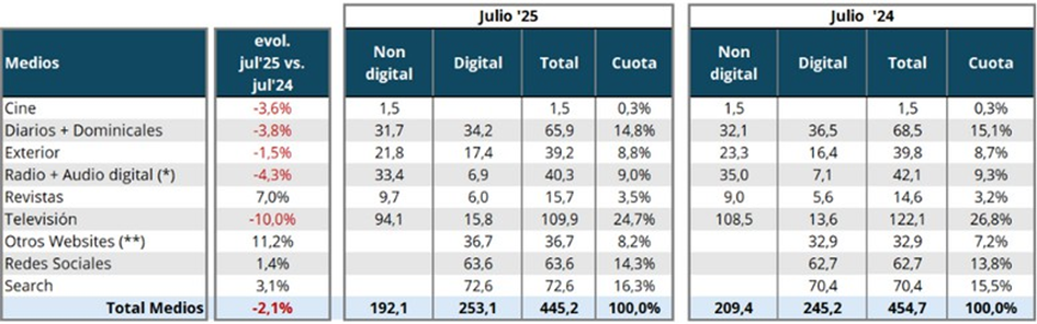 Durante el mes de julio de 2025, la inversión publicitaria ha alcanzado los 445,2 millones de euros, un -2,1% inferior que en el periodo equivalente del año anterior cuando el volumen registrado fue de 454,7 millones de euros.