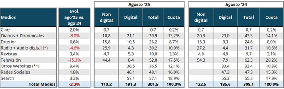 Durante el mes de agosto de 2025, la inversión publicitaria ha alcanzado los 301,5 millones de euros, un -2,2% inferior que en el periodo equivalente del año anterior cuando el volumen registrado fue de 308,1 millones de euros.